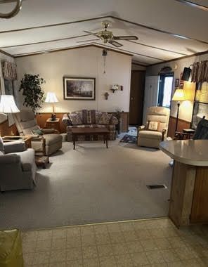RV lot for sale with 2001, 8'x32' Cardinal 5th Wheel trailer. Furnished with microwave, fridge, AC, and covered patio.